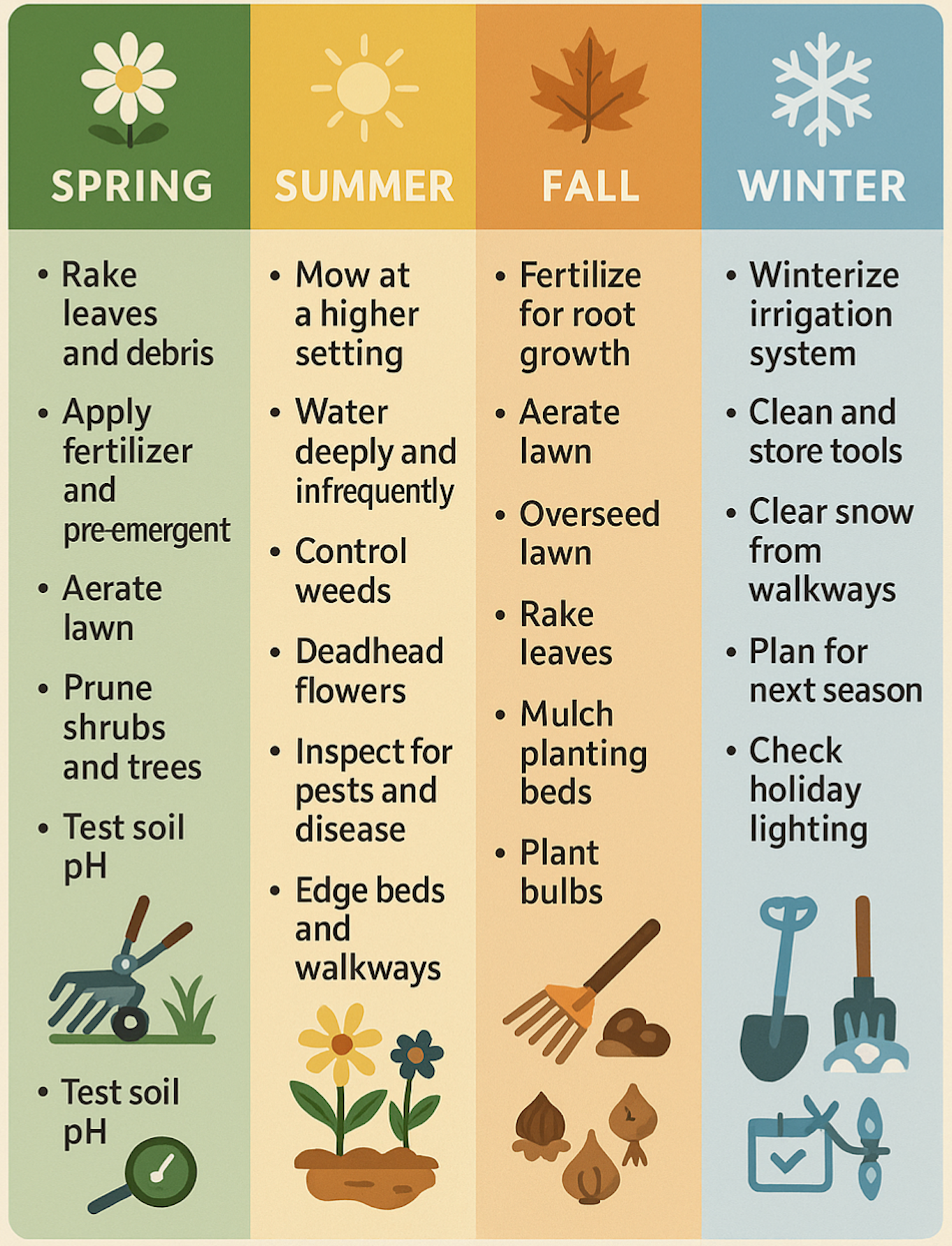 Stay on top of your outdoor chores year-round with our easy-to-follow Seasonal Lawn & Garden Care Calendar. Prairie Landscapes breaks down the key tasks for each season so you know exactly when to fertilize, prune, aerate, and more—keeping your yard healthy, beautiful, and ready for every activity.